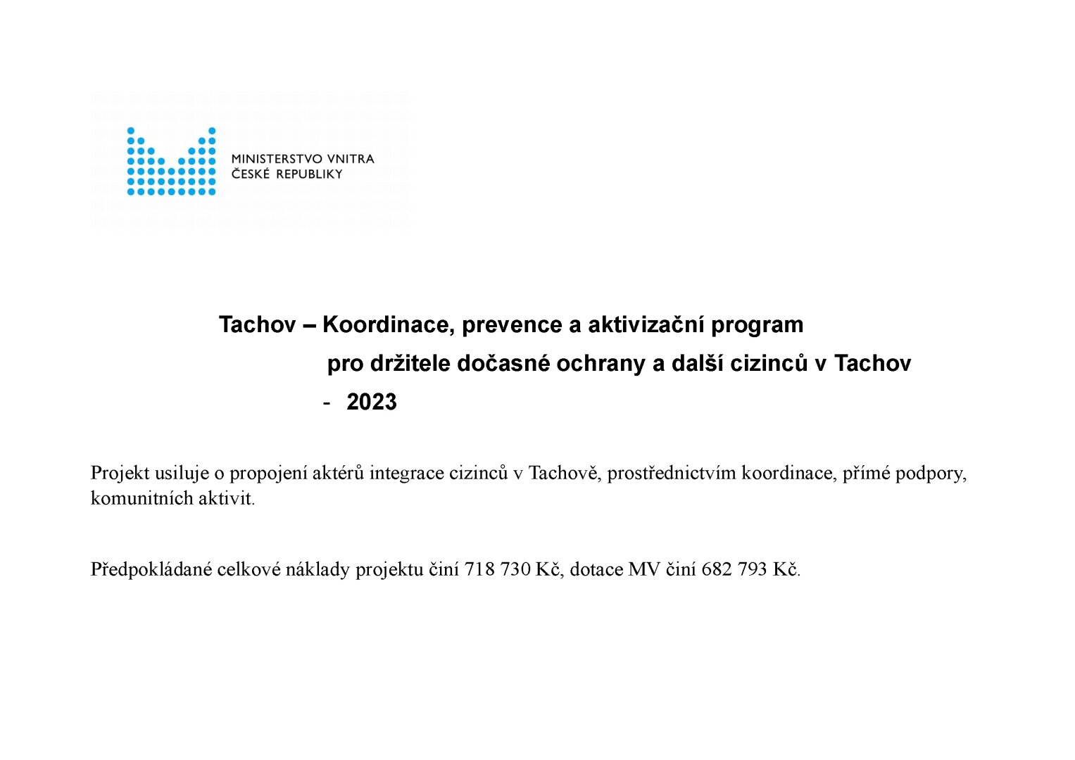 Město Tachov v roce 2023 realizovalo projekt zaměřený na podporu integrace držitelů dočasné ochrany a dalších cizinců. Cílem bylo vytvořit prostředí vzájemného respektu a spolupráce mezi místními obyvateli a nově příchozími. Projekt zahrnoval kurzy českého jazyka, sociokulturní orientaci, interkulturní asistenci a řadu komunitních akcí. Do aktivit se zapojily desítky účastníků i široká síť spolupracujících organizací, od neziskových spolků po státní instituce.