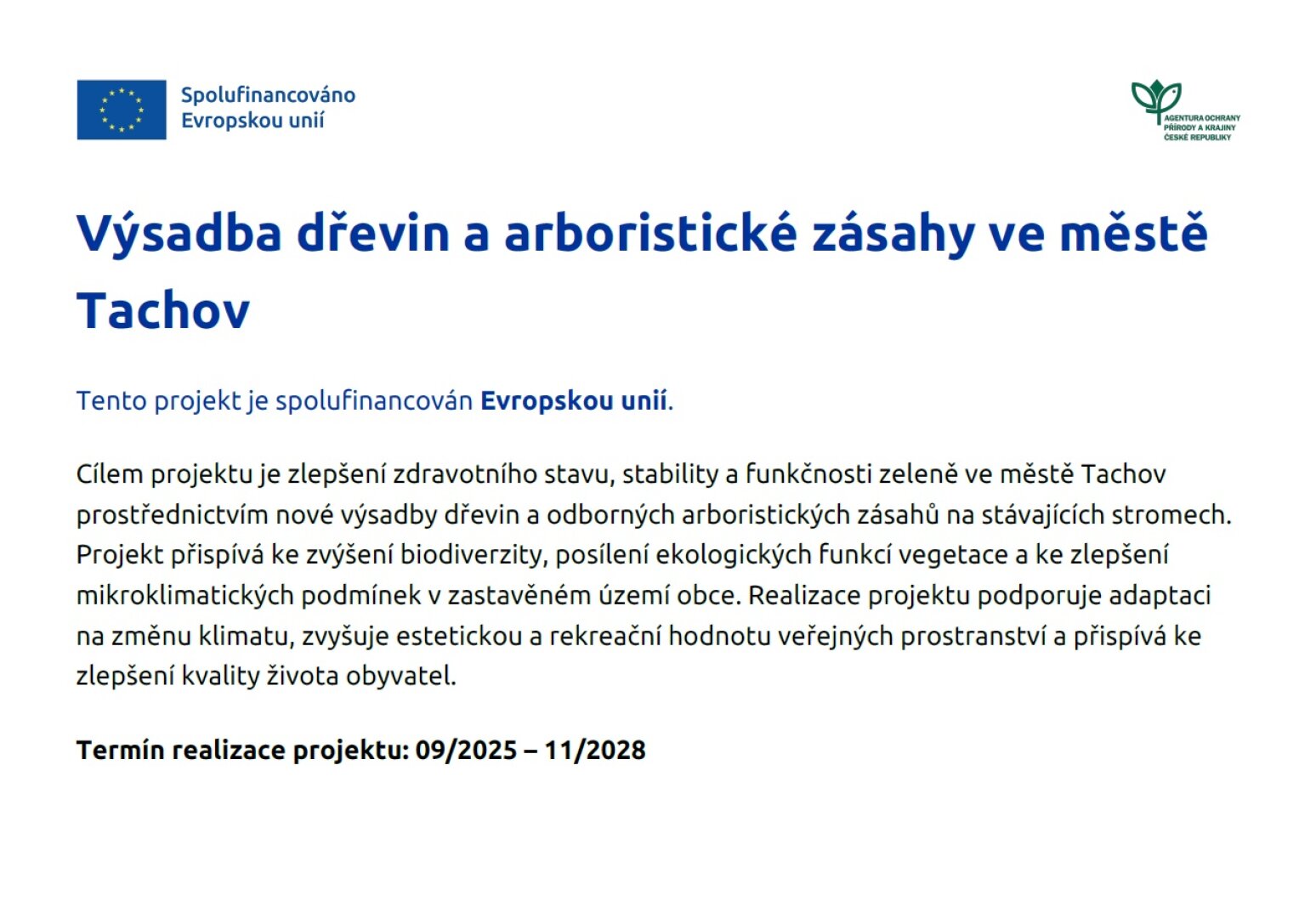 Cílem projektu je výsadba dřevin, tříletá následná péče o vysazené dřeviny a provedení arboristických zásahů ve městě Tachov. Realizací arboristických zásahů bude dosaženo výrazného prodloužení existence ošetřovaných dřevin, což má za následek pozitivní rozvoj lokality v rámci ekologické stability krajiny. Výsadba dřevin povede ke zvýšení rozlohy zeleně ve veřejném prostoru. Projekt je podpořen AOPK ČR v 9. výzvě SC 1.3 OPŽP.