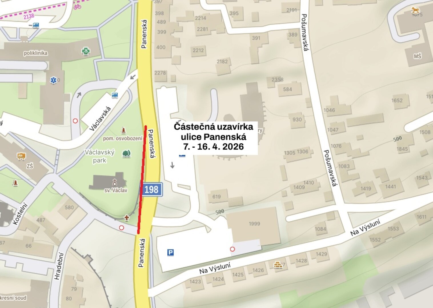 Z důvodu provádění monitoringu a sanace stoky bude uzavřen jeden jízdní pruh v ulici Panenská v úseku mezi světelnou křižovatkou a křižovatkou s ulicí Václavská a Hradební.