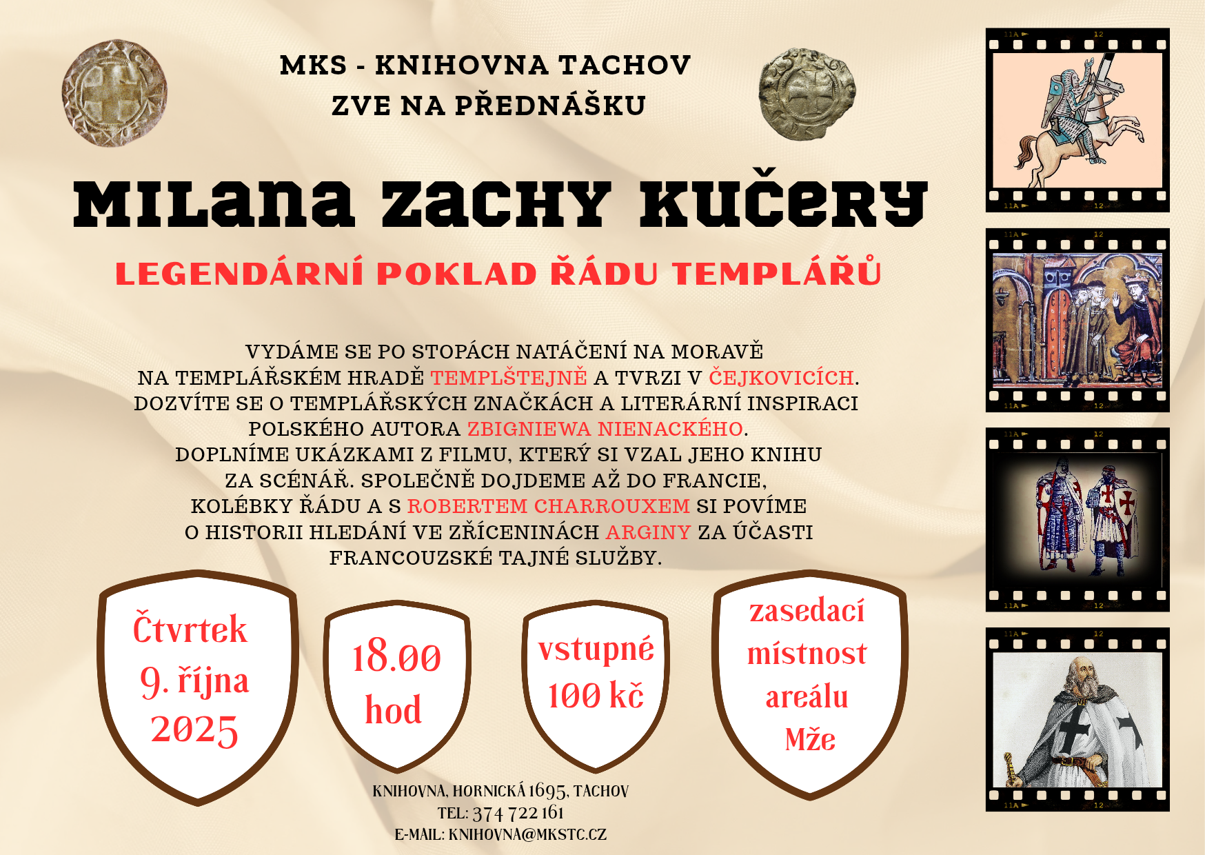 Přednáška vás zavede po stopách templářů – od Moravy, na hrad Templštejn a tvrz v Čejkovicích, přes literární inspiraci polského autora Zbigniewa Nienackého, až po Francii, kolébku řádu. Seznámíme se s templářskými značkami, ukázkami z filmů i historií hledání pokladů za účasti francouzské tajné služby.
