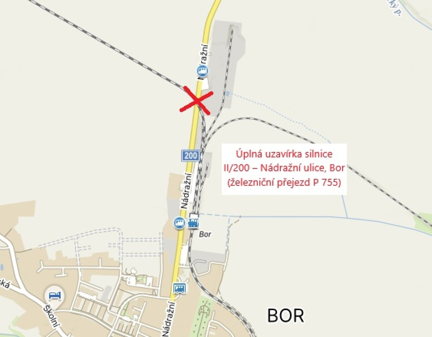 Úplná uzavírka silnice II/200 – Nádražní ulice, Bor (železniční přejezd P 755)