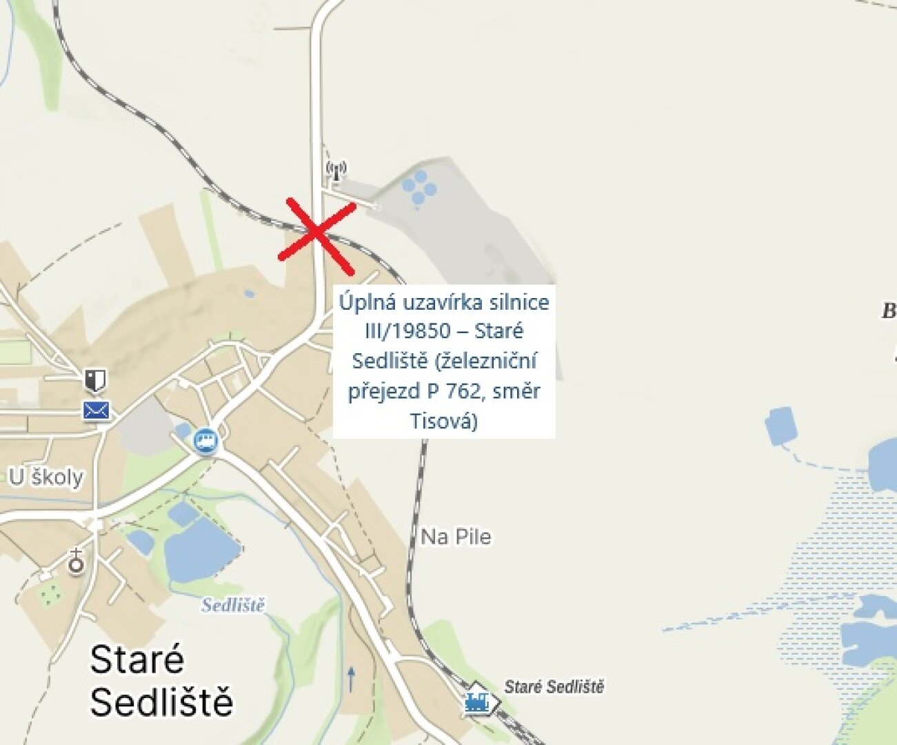 Objízdná trasa: po silnici II/199 Nová Hospoda – křižovatka „Kadrnožka“, dále po silnici II/605 na Bor a zpět.Úplná uzavírka silnice III/19850 – Staré Sedliště (železniční přejezd P 762, směr Tisová)