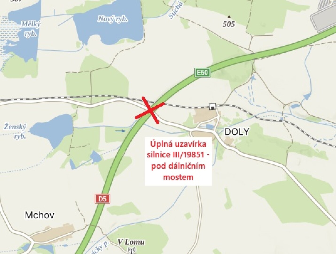 Objízdná trasa: Doly – III/19851 → Bor – III/19854 → Lužná – II/198 → Staré Sedliště – III/19849 a zpětÚplná uzavírka silnice III/19850 – u obce Mchov (směr Mchov – Labuť)