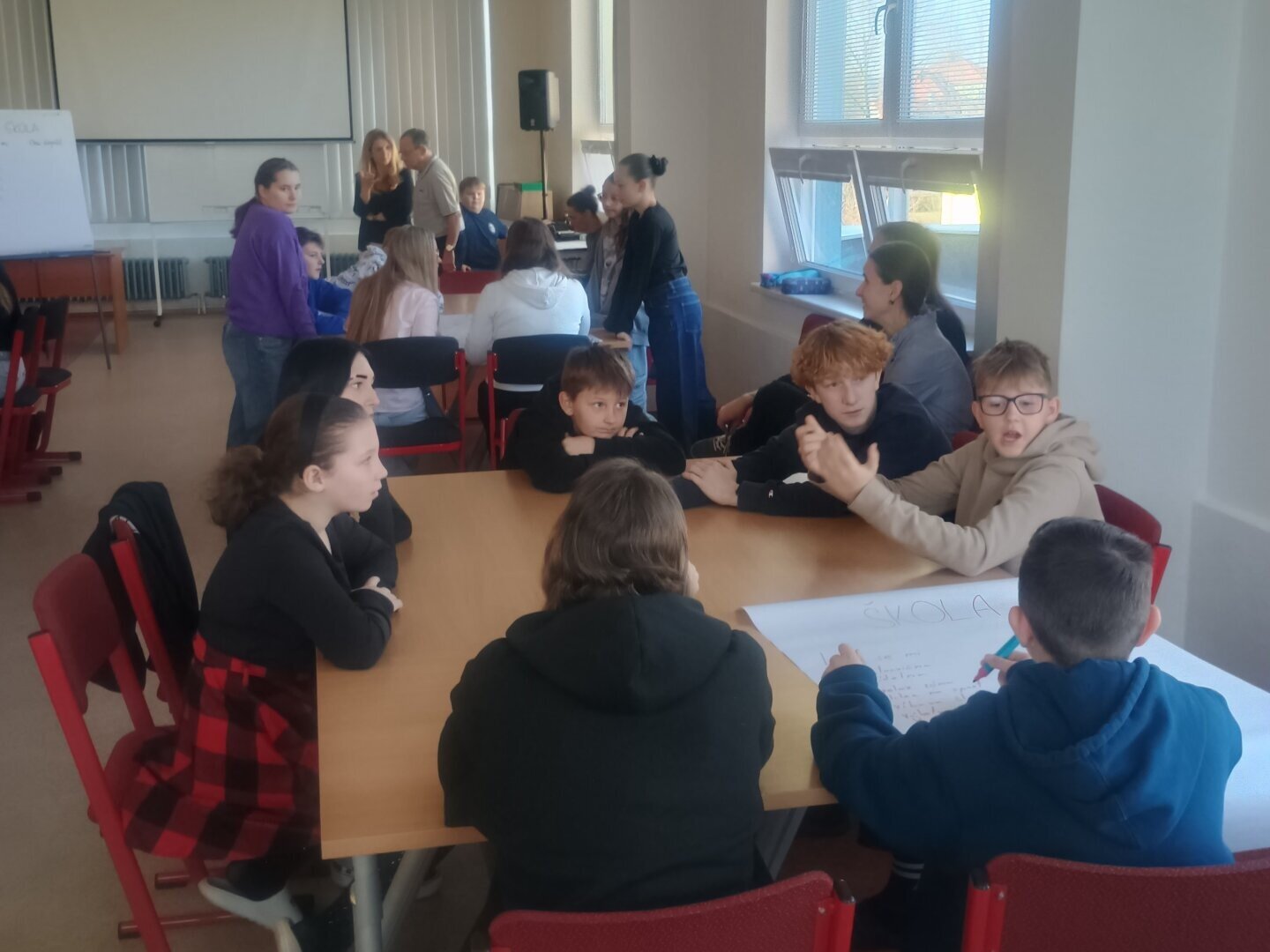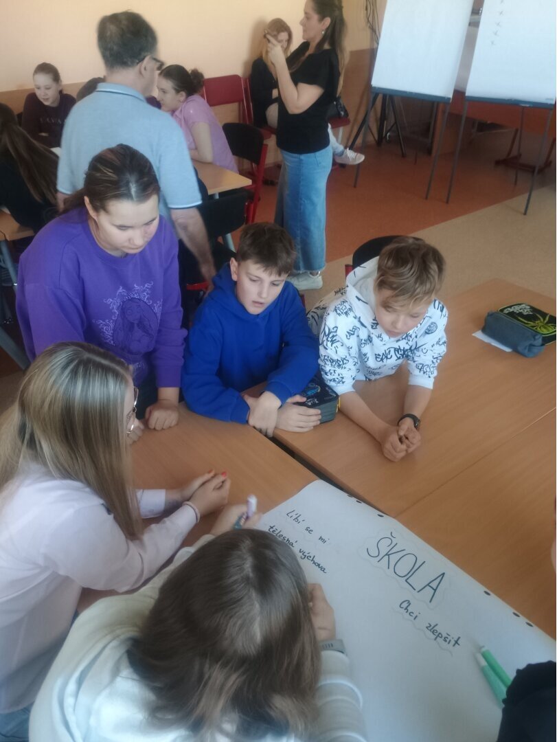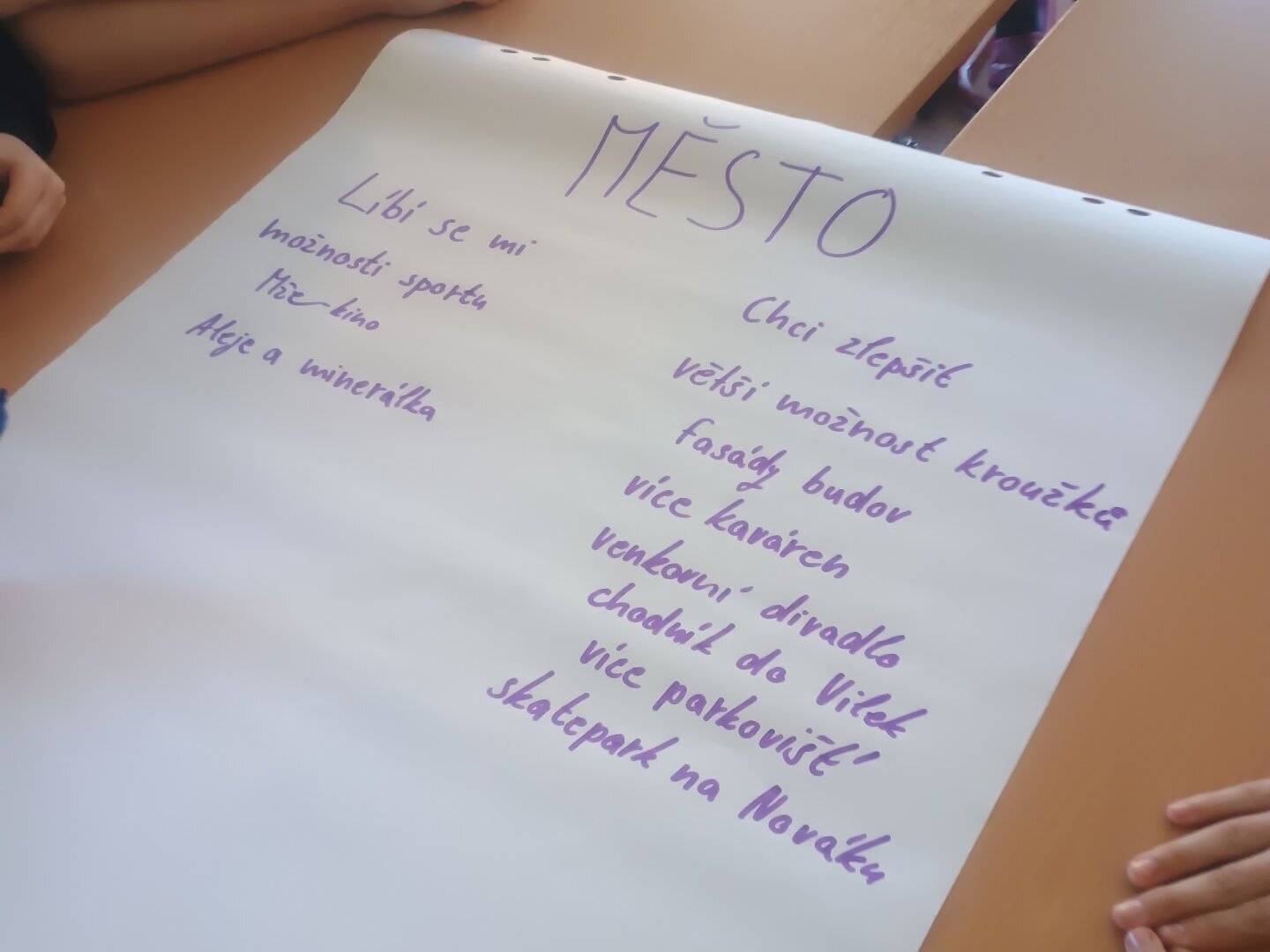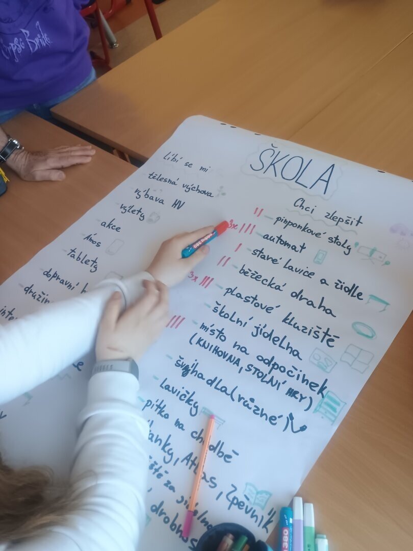 Po krátkém seznámení a představení přichystaného programu se žáci věnovali tématu školy. Ve skupinách spolu tvořili seznam věcí, které se jim na škole líbí a také seznam toho, co by se ve škole mohlo zlepšit. Z nápadů na vylepšení si ve skupině odhlasovali dva návrhy, které prezentovali před ostatními. Na závěr tak vznikl seznam osmi finálních nápadů, mezi které žáci rozdělili své hlasy. Stejným způsobem proběhl i blok věnovaný městu.