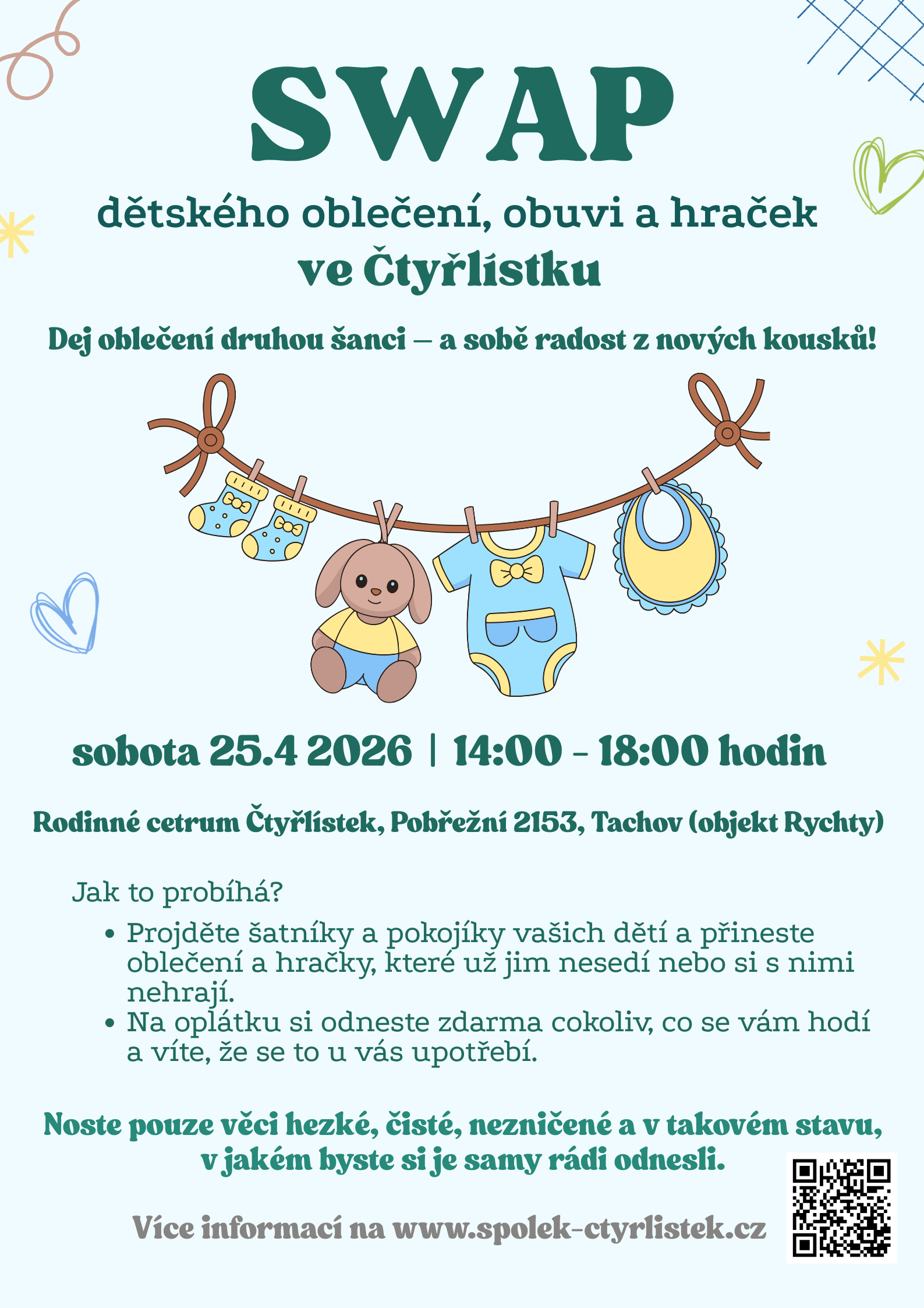Projděte šatníky a pokojíky svých dětí a přineste oblečení a hračky, které jim už nesedí nebo si s nimi nehrají. Na oplátku si odneste zdarma cokoliv, co se vám hodí a víte, že se to u vás upotřebí. Swapovat (vyměňovat) se bude pouze dětské oblečení a hračky. Na akci je umožněn opakovaný vstup.