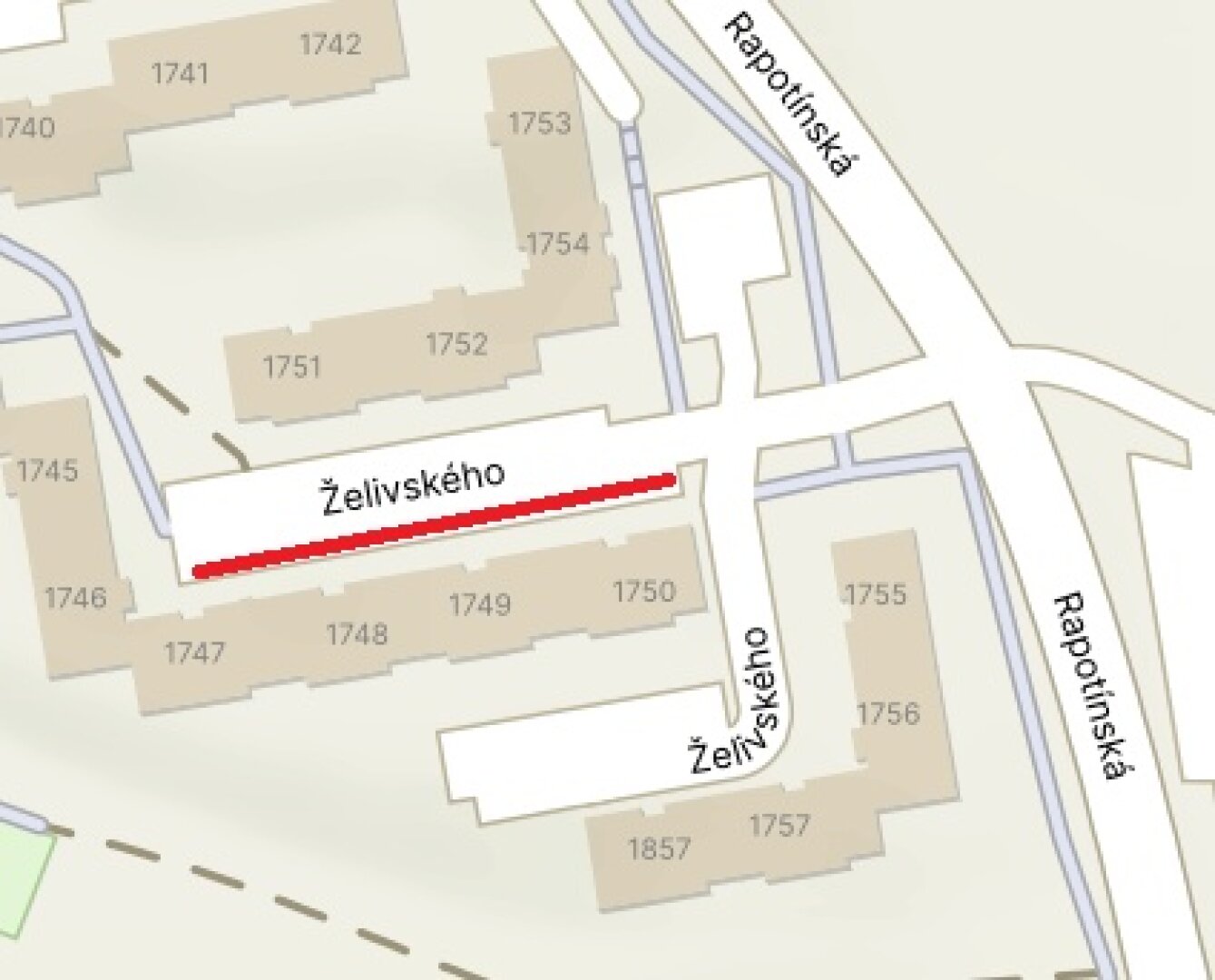 Uzavírka chodníku a přilehlého parkoviště v ulici Želivského na sídlišti Rapotín